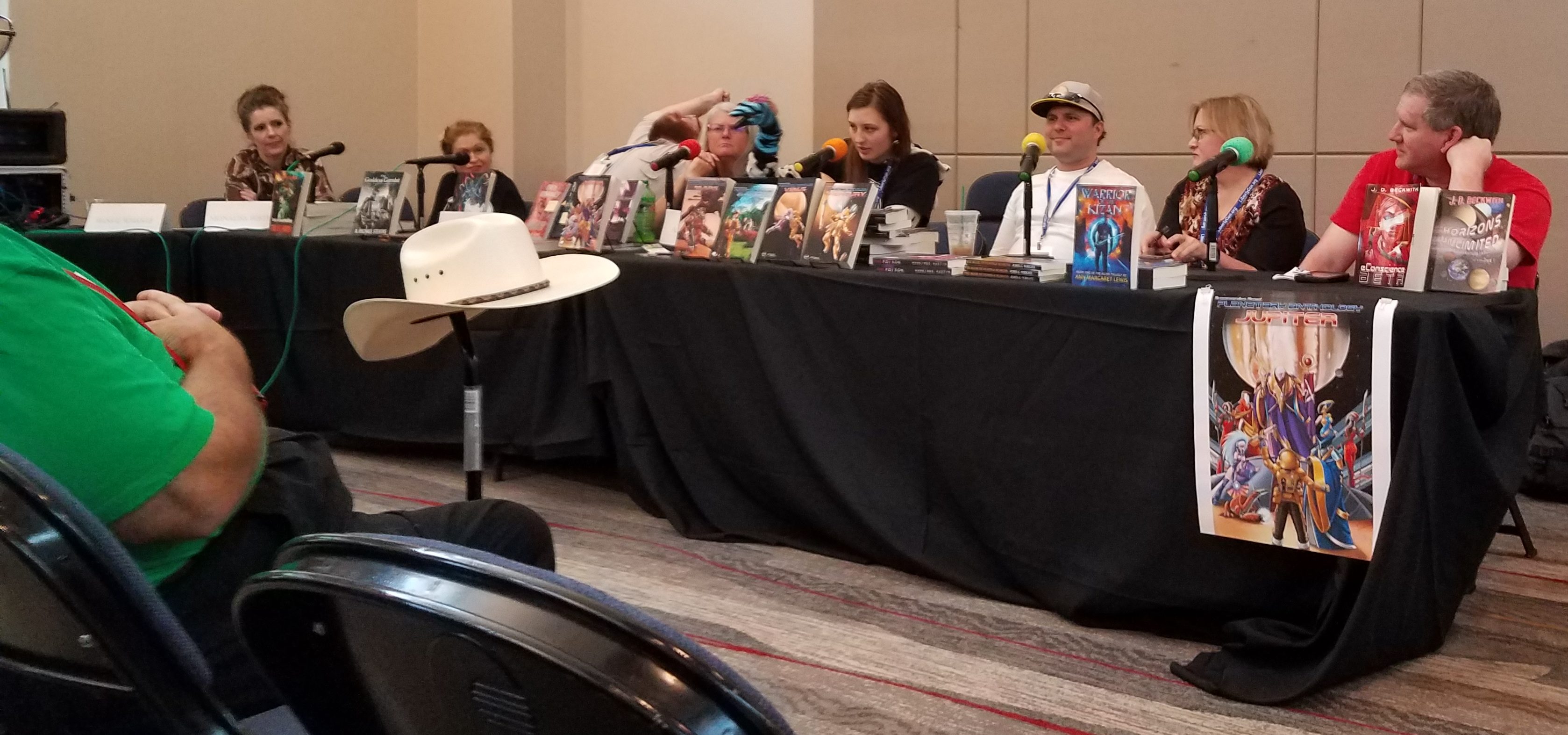 The Superversive Press Panel, hosted by the Mistress of Dancing Cows, A.M. Freeman, began with introductions, and a word from the Avatar of the Publisher, Sir Jason Rennie. The voice sounded oddly like that of Jon Del Arroz with a really bad accent from the Upside-Down Kingdom, but that may just be my perception. Many of the books of Superversive nature, including the newly realeased Planetary Anthology: Jupiter, were present and on display. The panel’s members included: Julie Pascal, Jon Del Arroz, A. M. Freeman, Julie Frost, Ben Wheeler, Marina Fontain, Monalisa Foster, Arlan Andrews, Hans Schantz and myself. It was a great time for me as I was able to meet some of the many Digital Realm acquaintances face-to-face for the first time.