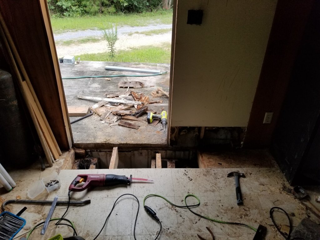 This took me from about 1 PM to 7 PM to get done. It was 80+ degrees, and I refused to run the shop AC while the door was open, so I only had a small breeze. I spent most of that time sitting and bending to cut away rotted wood. I actually have bruises on my knees!
