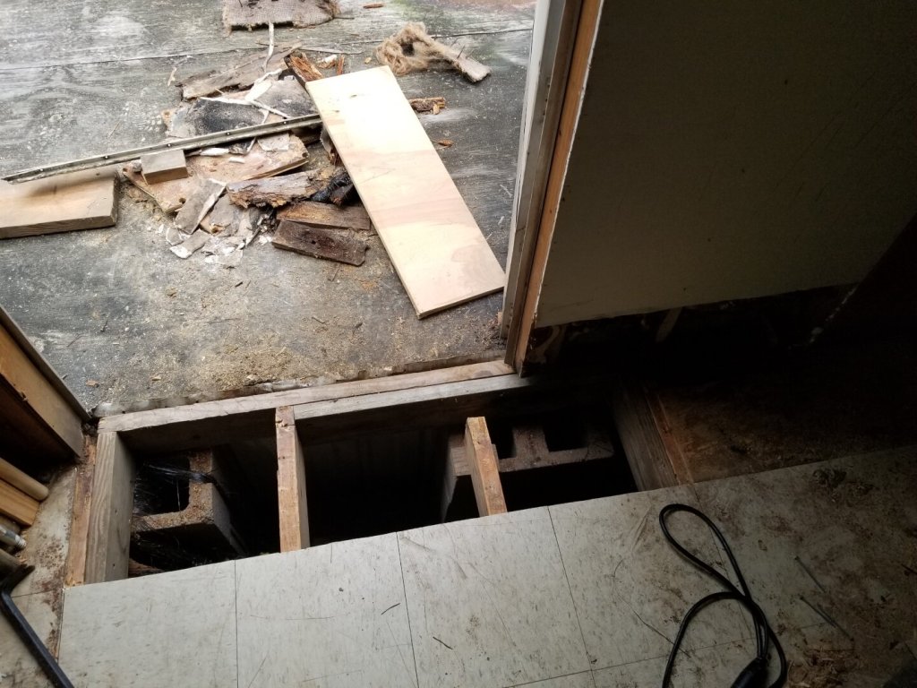 I had to cut about a 14″ x 4′ section out of the floor, plus a 5″ x 12″ section under the wall. The 2×6 joist header was almost completely rotted away, as was the first couple inches of two floor joists and the wall sill board.