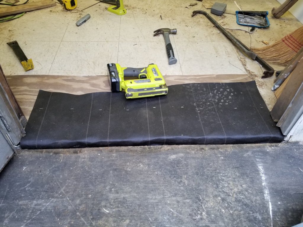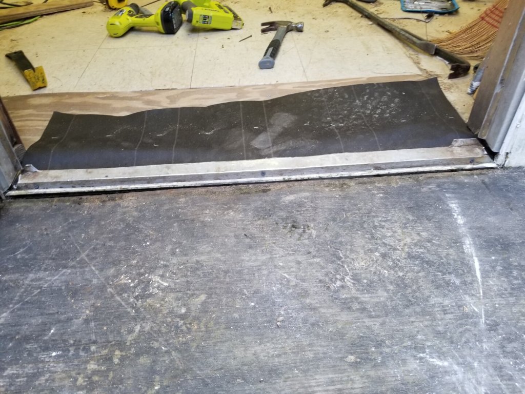 The only plywood I had that was pressure treated was 3/4″ think. The original flooring was 1/2 (or 5/8?), so this meant that the door frame had to get cut higher before I could get the bottom section back in.