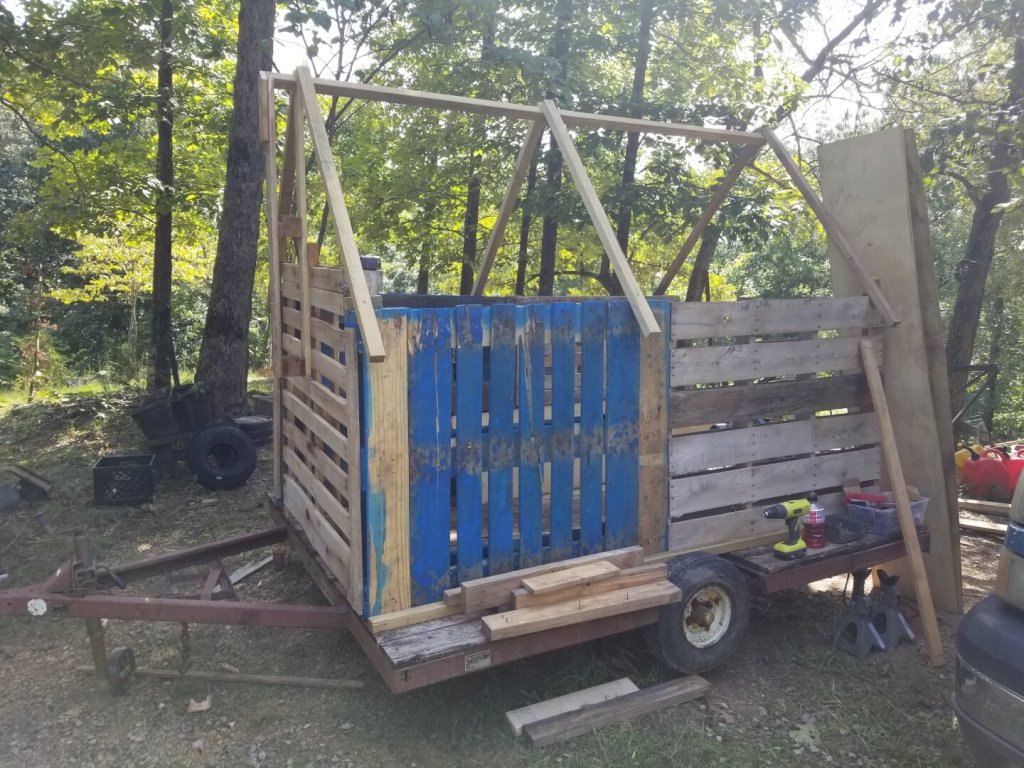 The next step was to figure out how to do a roof. I used a cut-off pallet rail and some 2×2’s to make a ridge with an open a-frame on the entry end a the back. I also blocked off the fork entry holes with some scrounge pallet boards.