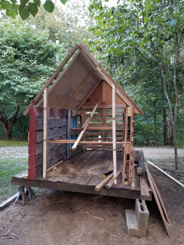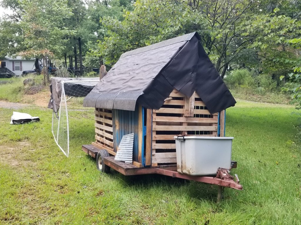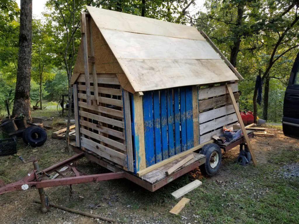 Now my trailer is for guineas, and it runs on tires, but I’m sure you can see the similarities to Baba Yaga’s hut. So, since its a cludged together redneck build, I decided to call it. BUBBA YAGA!