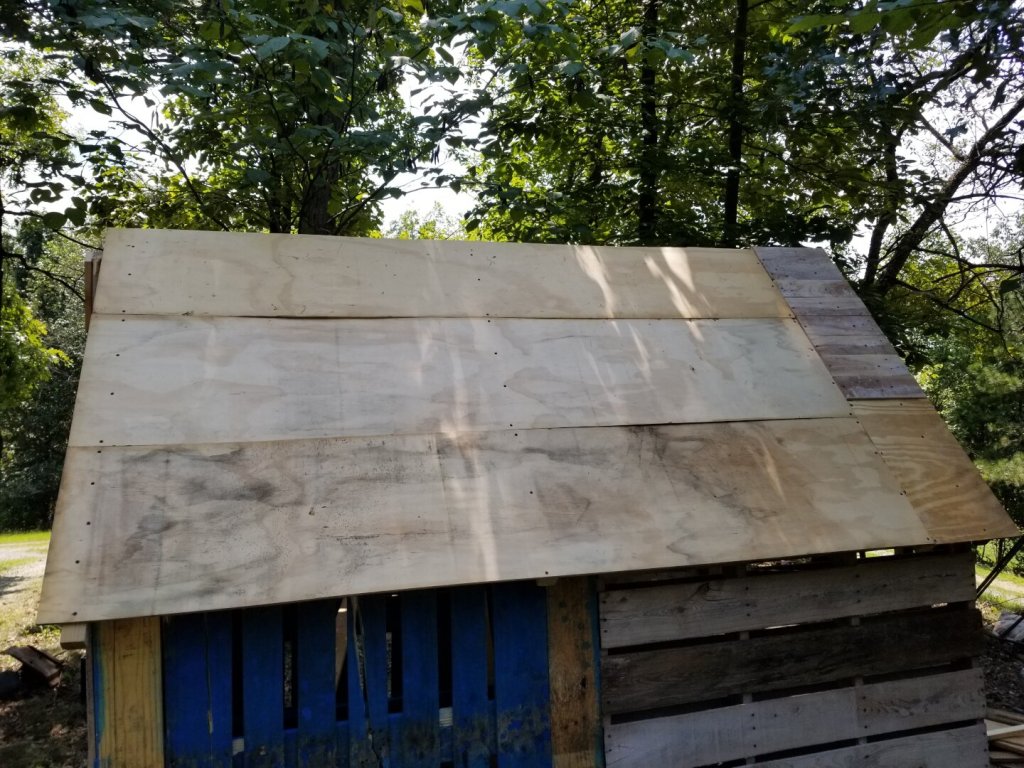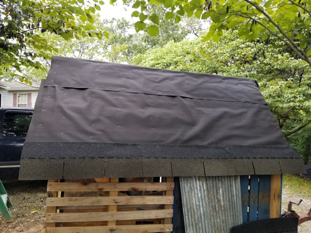 My original intent was to put the tar paper down and throw some old shingles I had on top of that. Unfortunately, I did not have enough shingles to cover the whole thing, so I decided to let it go with just the paper. It may not last, but as of this posting it has been rained on several times and is not leaking.