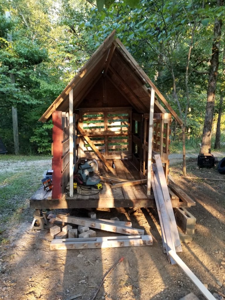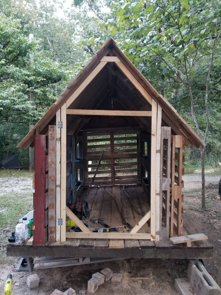 Once I figured that out, I was able to break apart the pallets I had left and cut them up to make the rest of my roofing boards. I had to throw extra truss beams in there where needed to match up with the pallet board lengths I had.