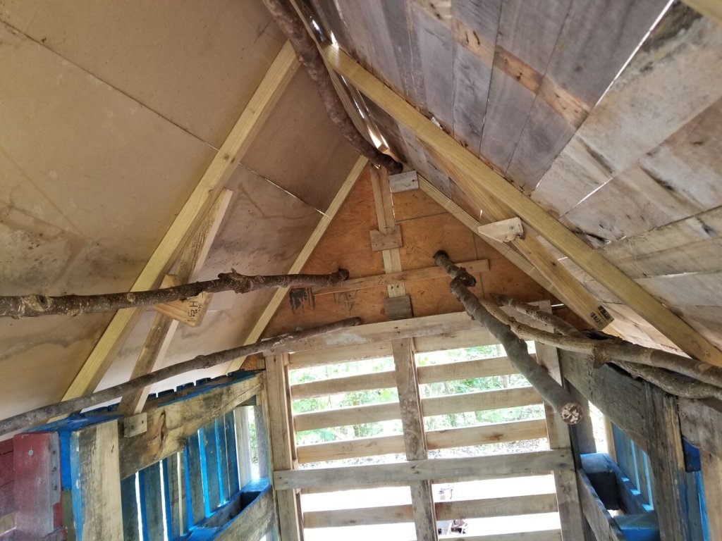 I wanted the roost poles high up to take advantage of rising heat and narrower spaces. The whole thing is very open right now with the pallet slats, but I plan to wrap it for winter time, either in plastic or possibly tar paper. For now, as long as they are too small for coons and possums, I’m good.
