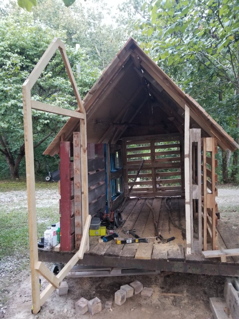I used some cut-off pallet rails to fill in the gaps. I did end up tweaking the door and straightening it a bit later on.