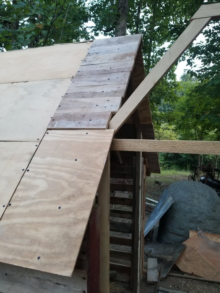 Then it was time to finish up the roof. I had run out of big pieces to use, so I needed to change over to pallet boards. The pallets were very hard to take apart until I figured out the trick, which was to use my reciprocating saw to cut the seams apart by just cutting the nails.