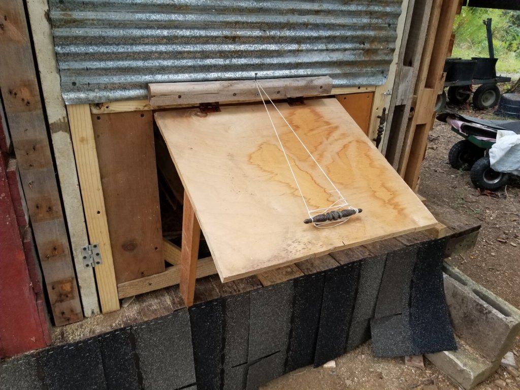 I scrounged some old cabinet handles for the main door & flip up door, and also added a hook latch & a bar to keep the flip door secured. A skirt on the back to keep the guineas from going under the trailer when the run is attached was also needed, so I used some more of the shingles split in half.