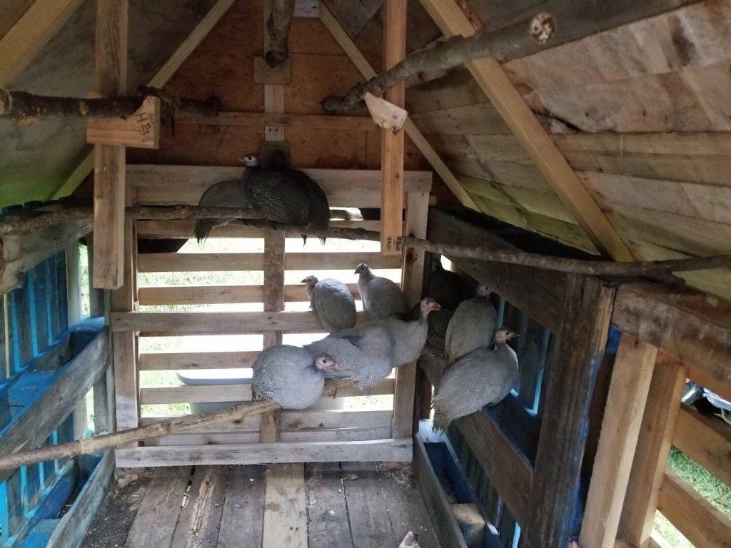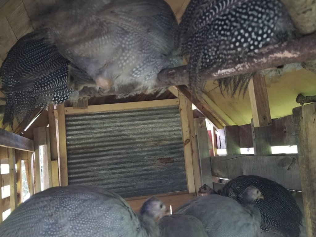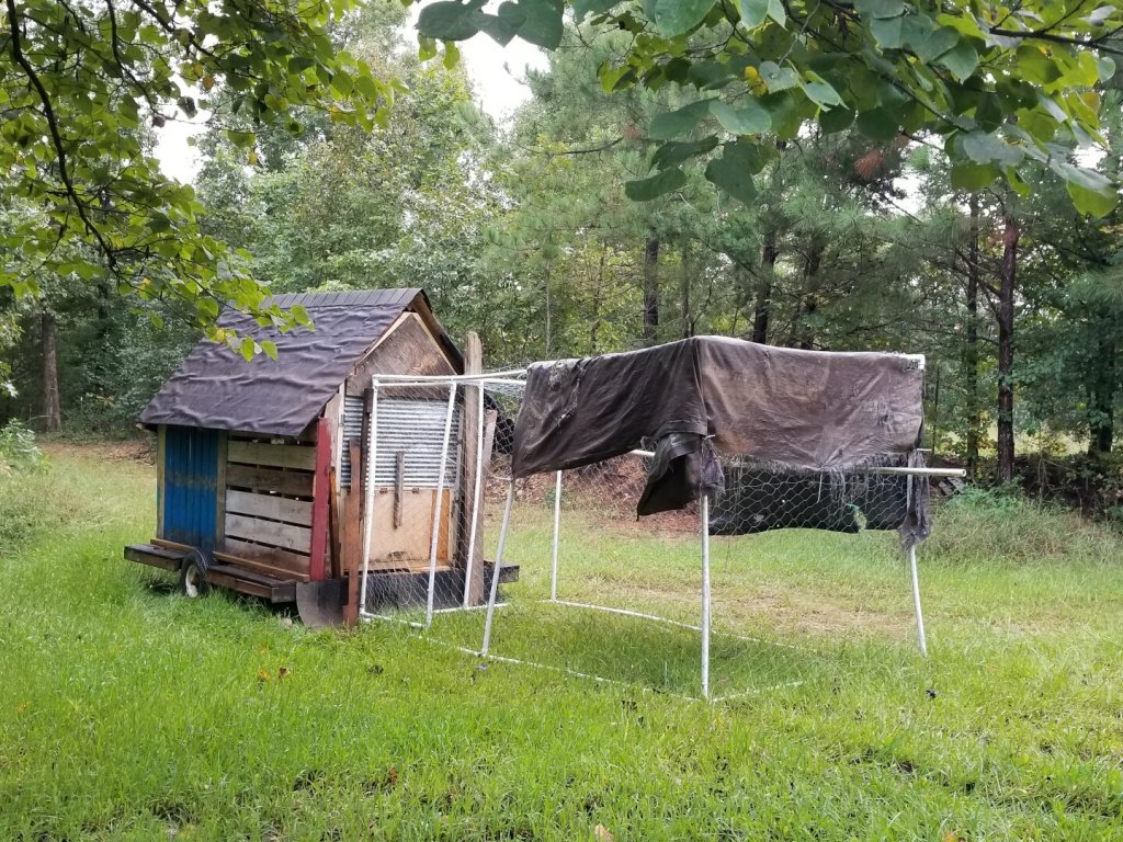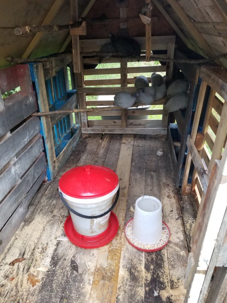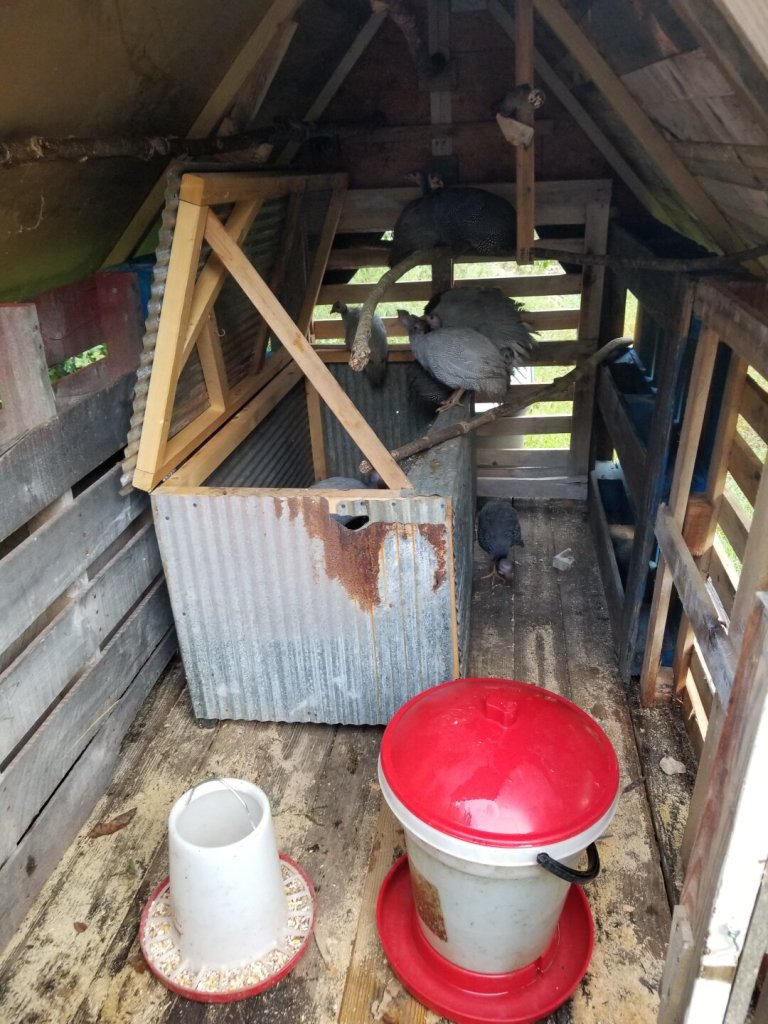The redneck Bubba Yaga in the trial location. The ratty old tarp is just for shade. The run itself is temporary. Once the guineas are used to coming home to roost inside, I’ll repurpose that for other birds.