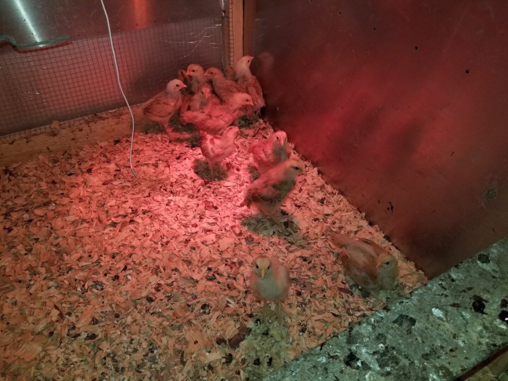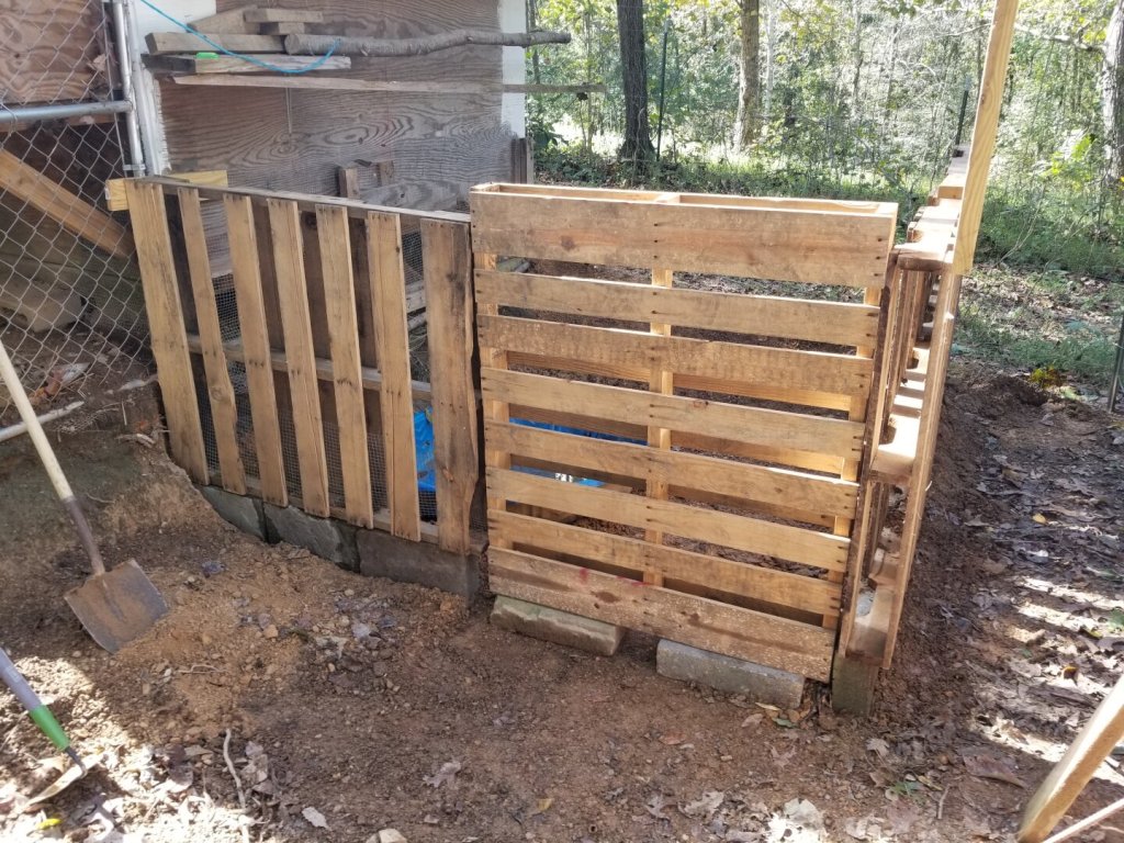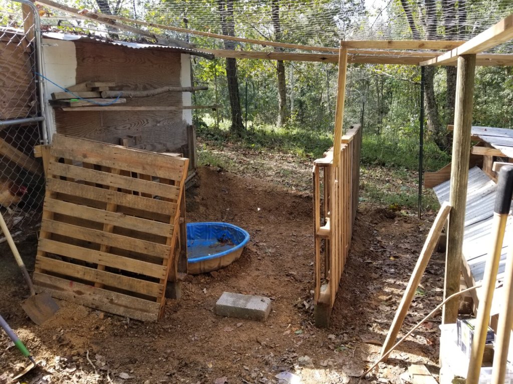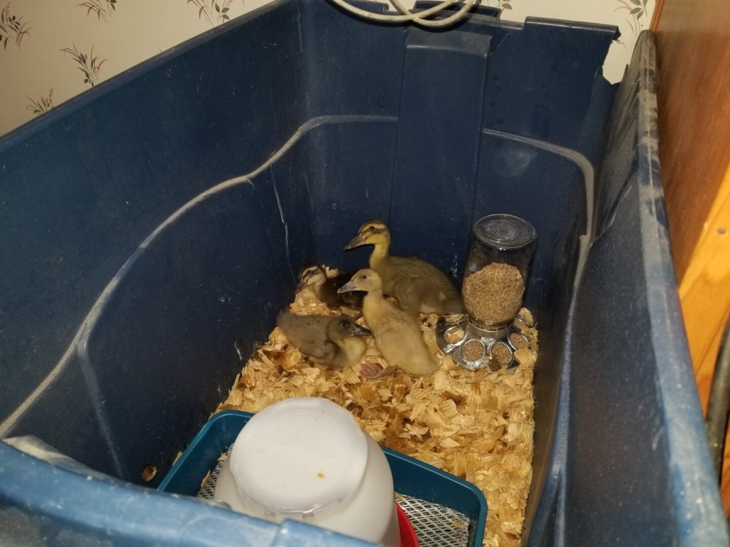 I decided to use pallets set on blocks. I had some scraps to tie things together. I plan to add heavy duty hinges to on pallet and just use it as a gate. I moved the brooder down, leveled the kiddie pool and dropped the extension cord for the brooder light. After the little ducks get a bit bigger, they will be moved in. Once they get big enough that they can’t get through the slats of the pallets, I’ll turn the brooder on it’s side and just lock them in at night.