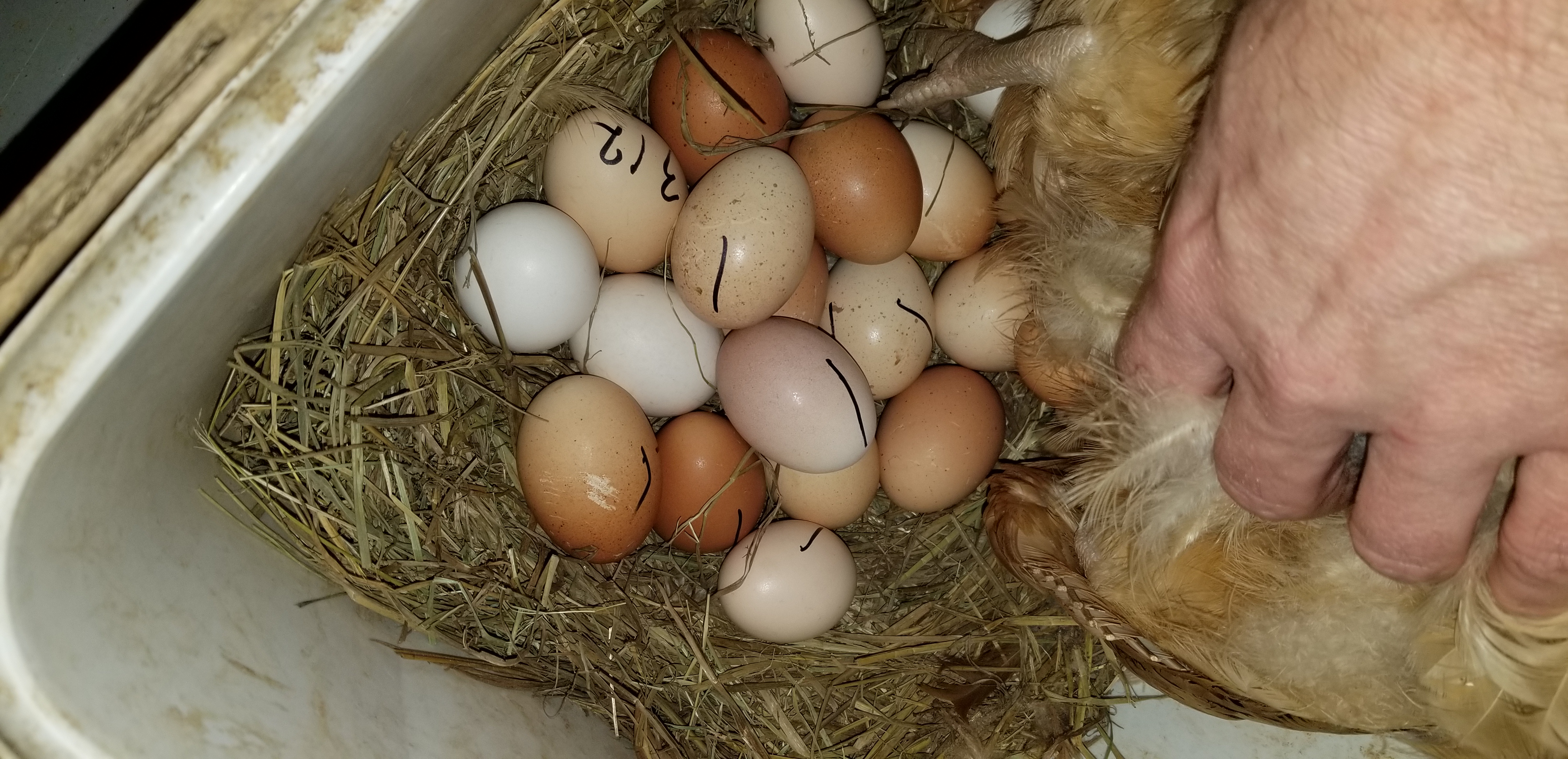 She decided to start setting about a week before I put the Blue Laced Red Wyandotte eggs (see last post) in the incubator. It got down really cold several times while she was on these, but she kept them going. All the other hens just had to lay in the same nest, even as she was starting to go broody, so she ended up sitting on 21 eggs!