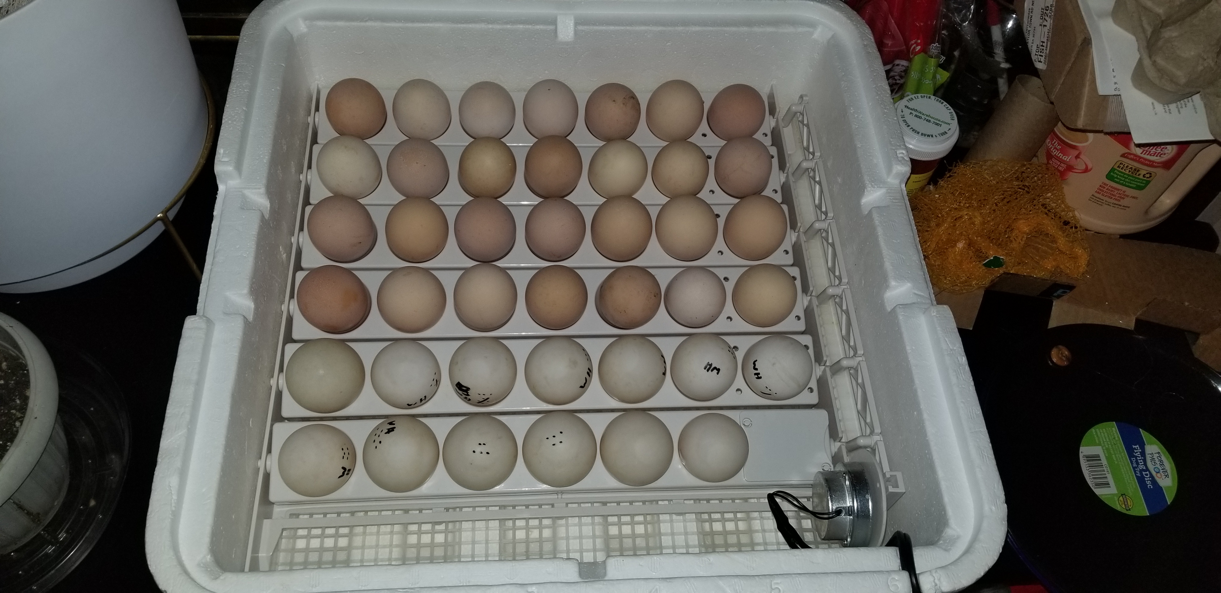I started my incubator out with 28 Blue Laced Red Wyandotte eggs & 13 Welsh Harlequin.