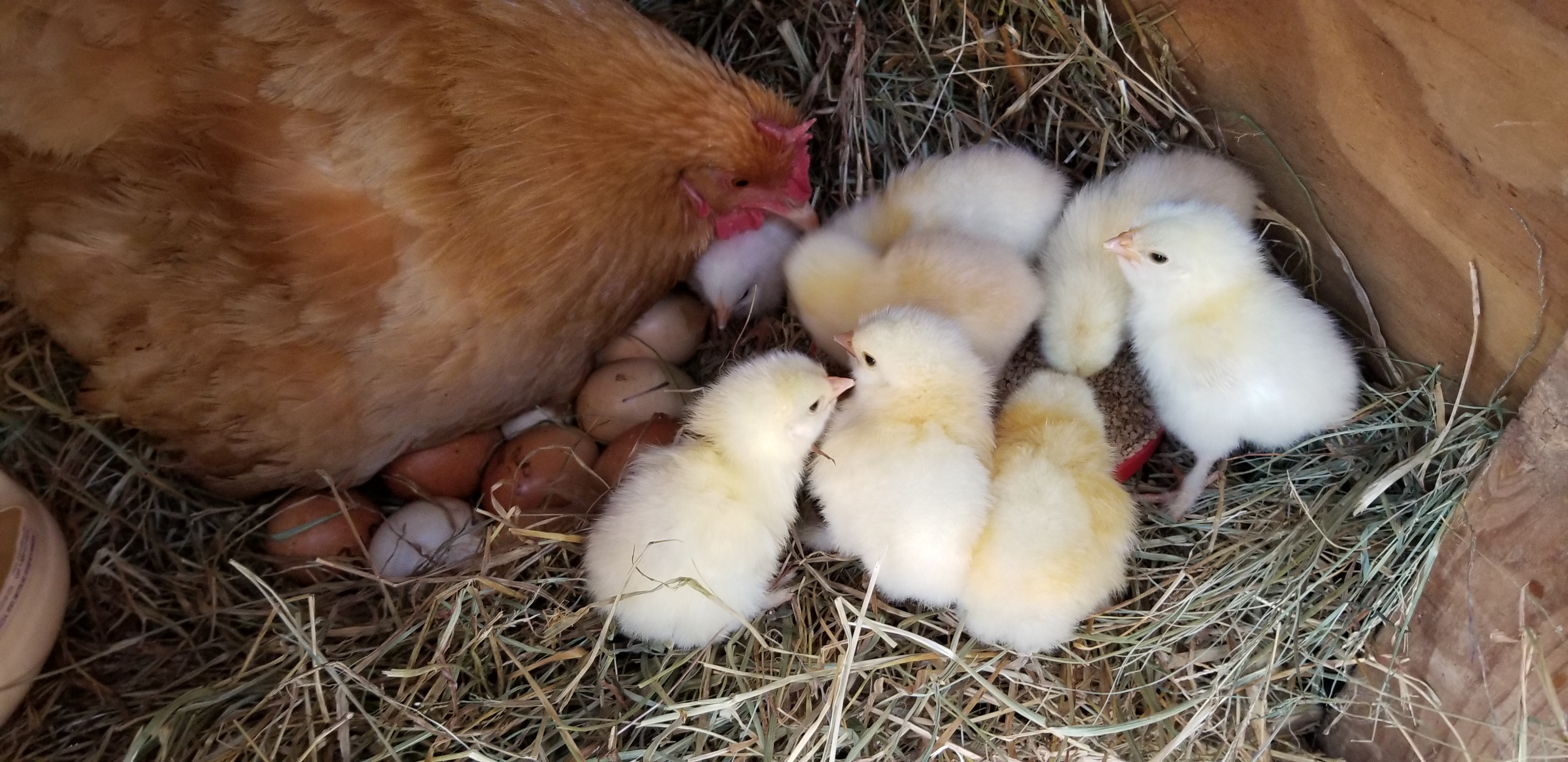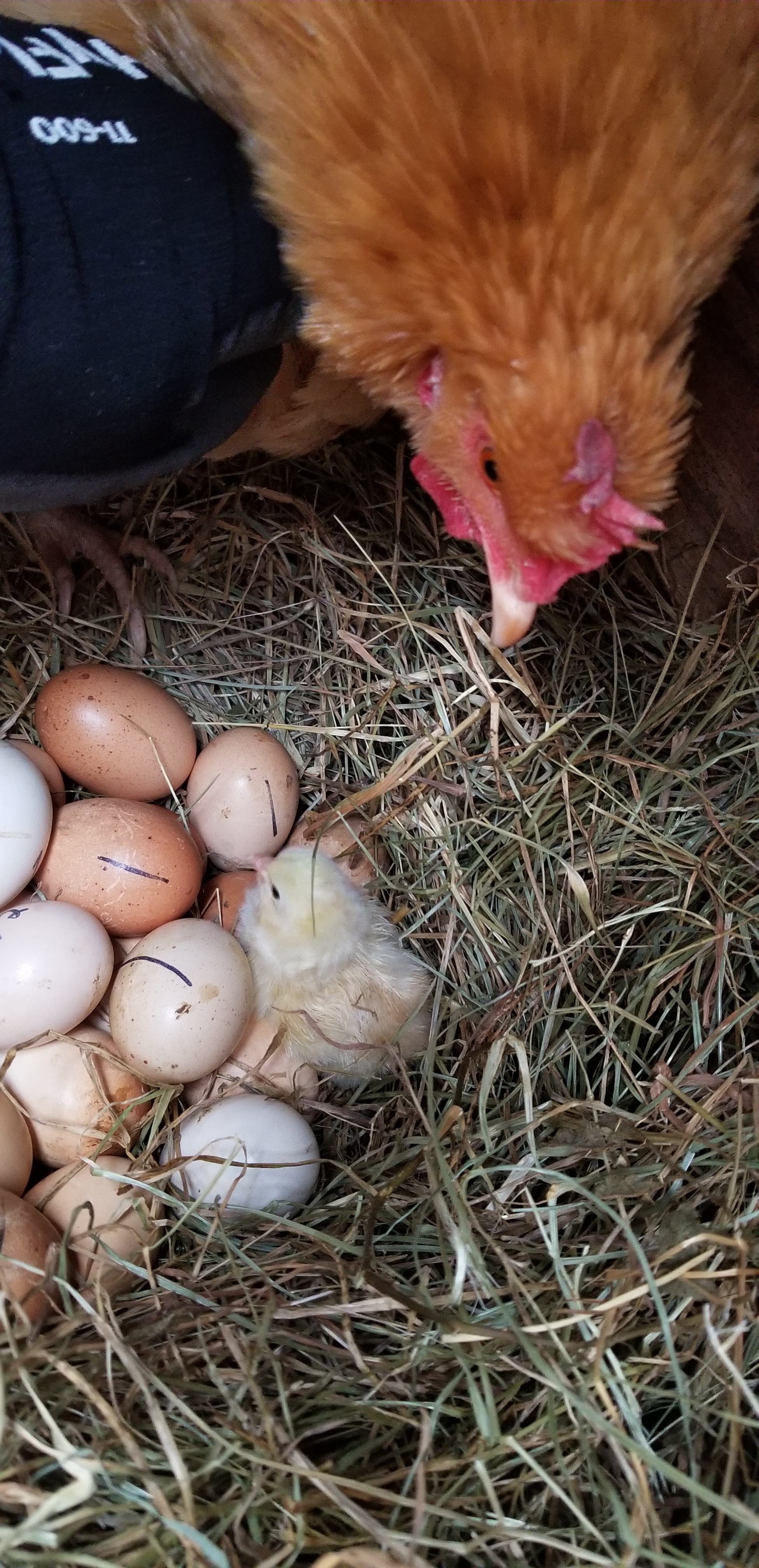 Over the course of 4 days, she hatched out 10 of the 21 eggs. The rest were simply not viable. I cracked them open to check and there were no chicks in them. I was surprised because all the roosters were quite busy. Maybe they just kept interrupting each other too much?