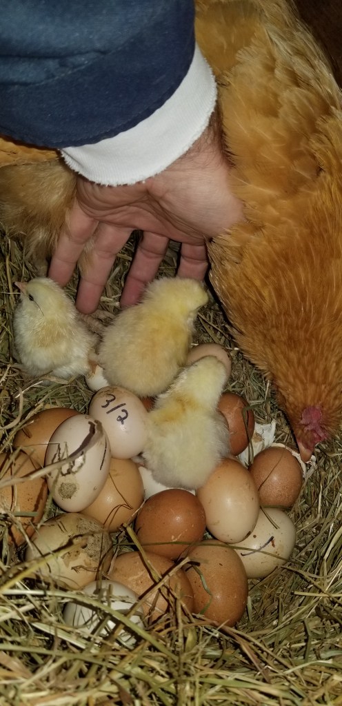 It quickly became apparent that the space was not big enough for the group. Momma liked to scratch in the nesting hay, which occasionally resulted in a yeeted baby bird. I lost one of them when it got stuck upside down in the door frame where Momma Hen could not get to it and get it out.