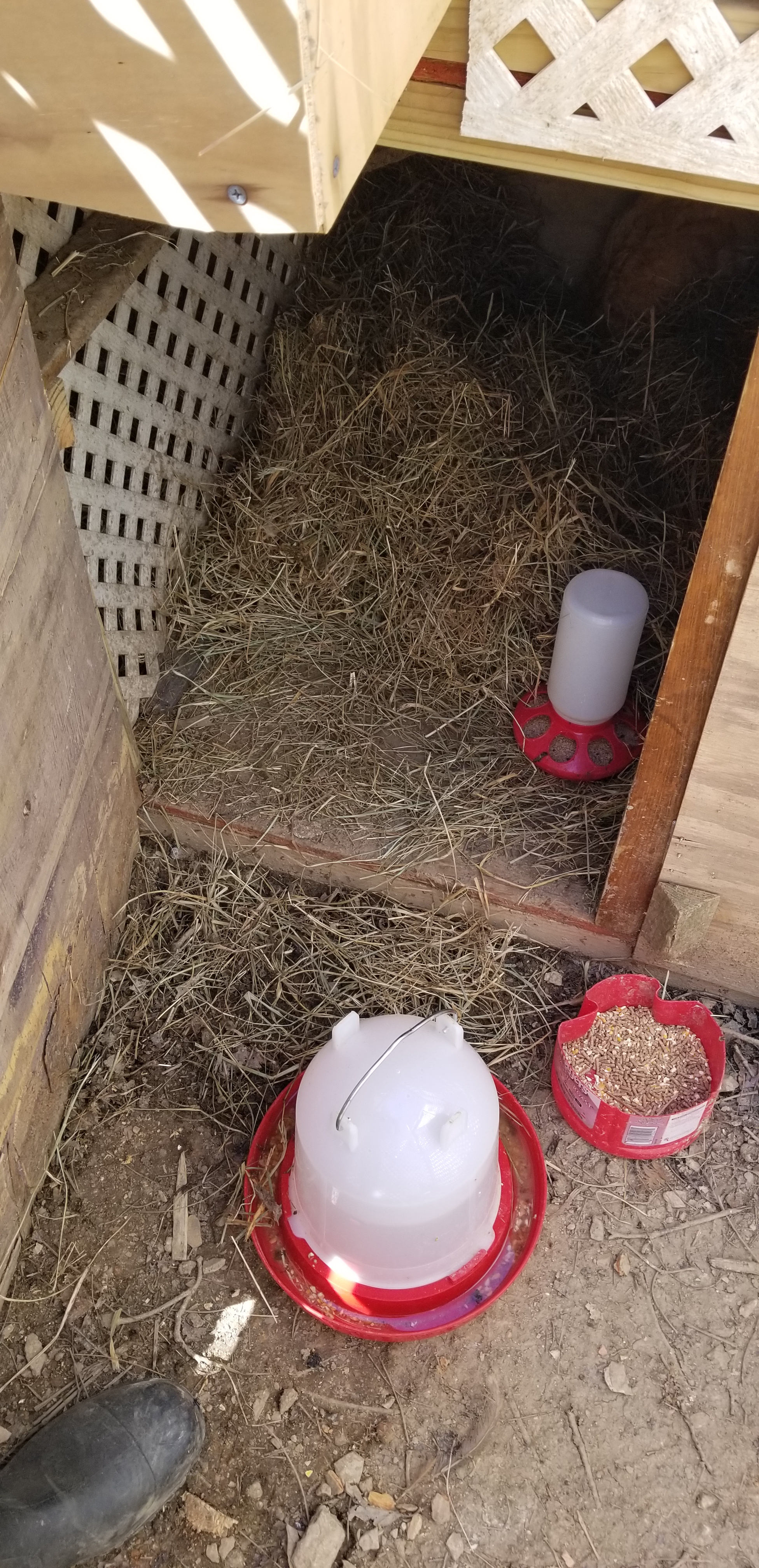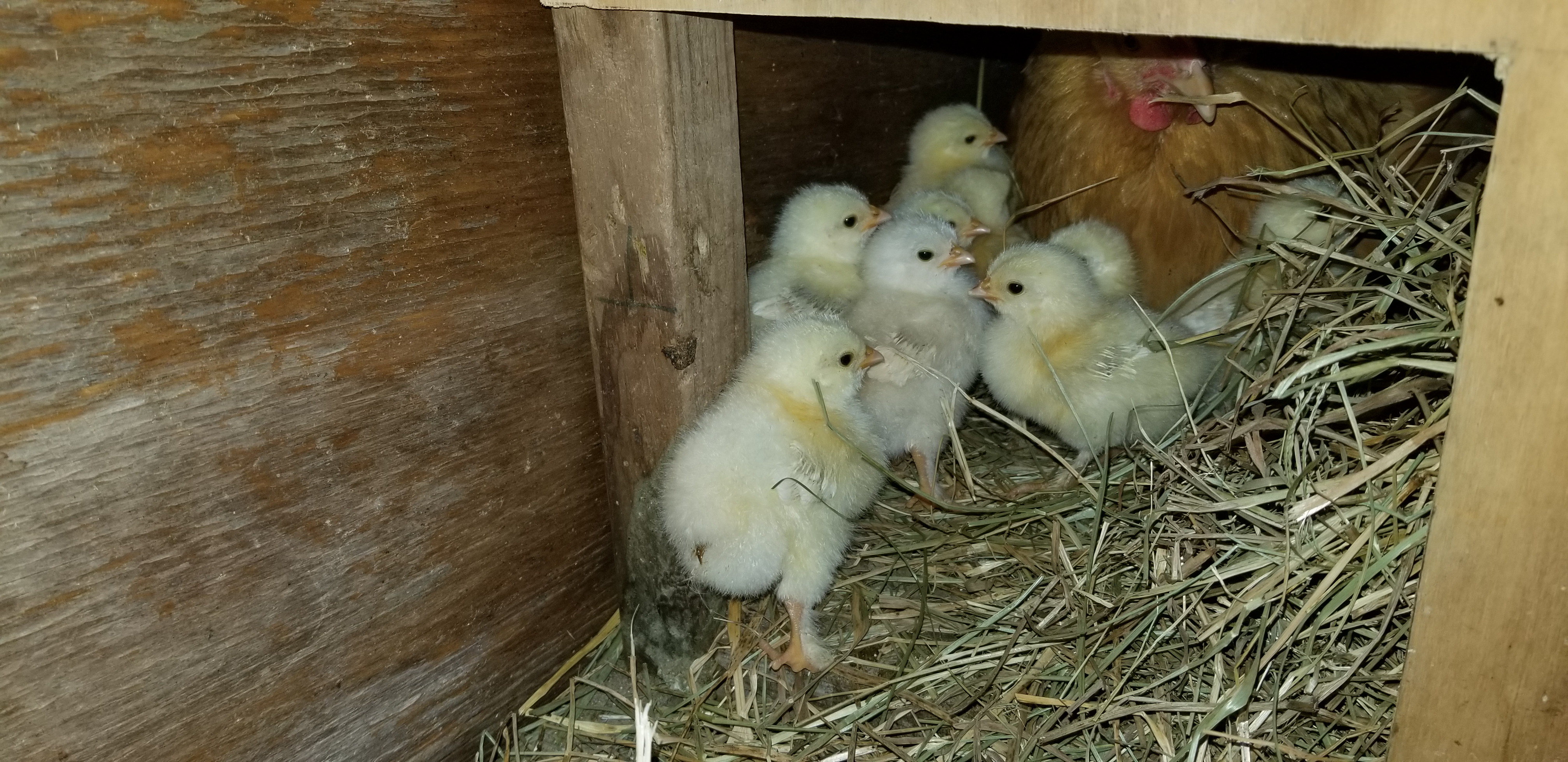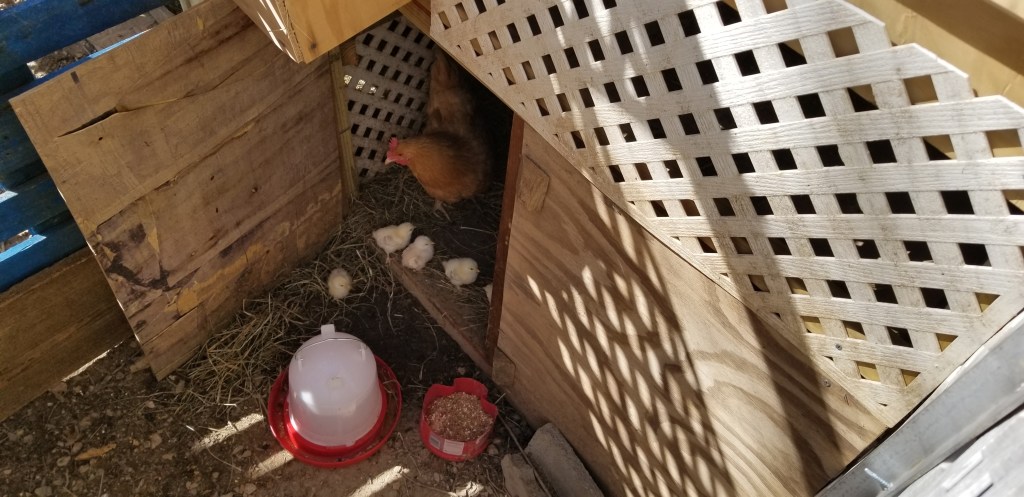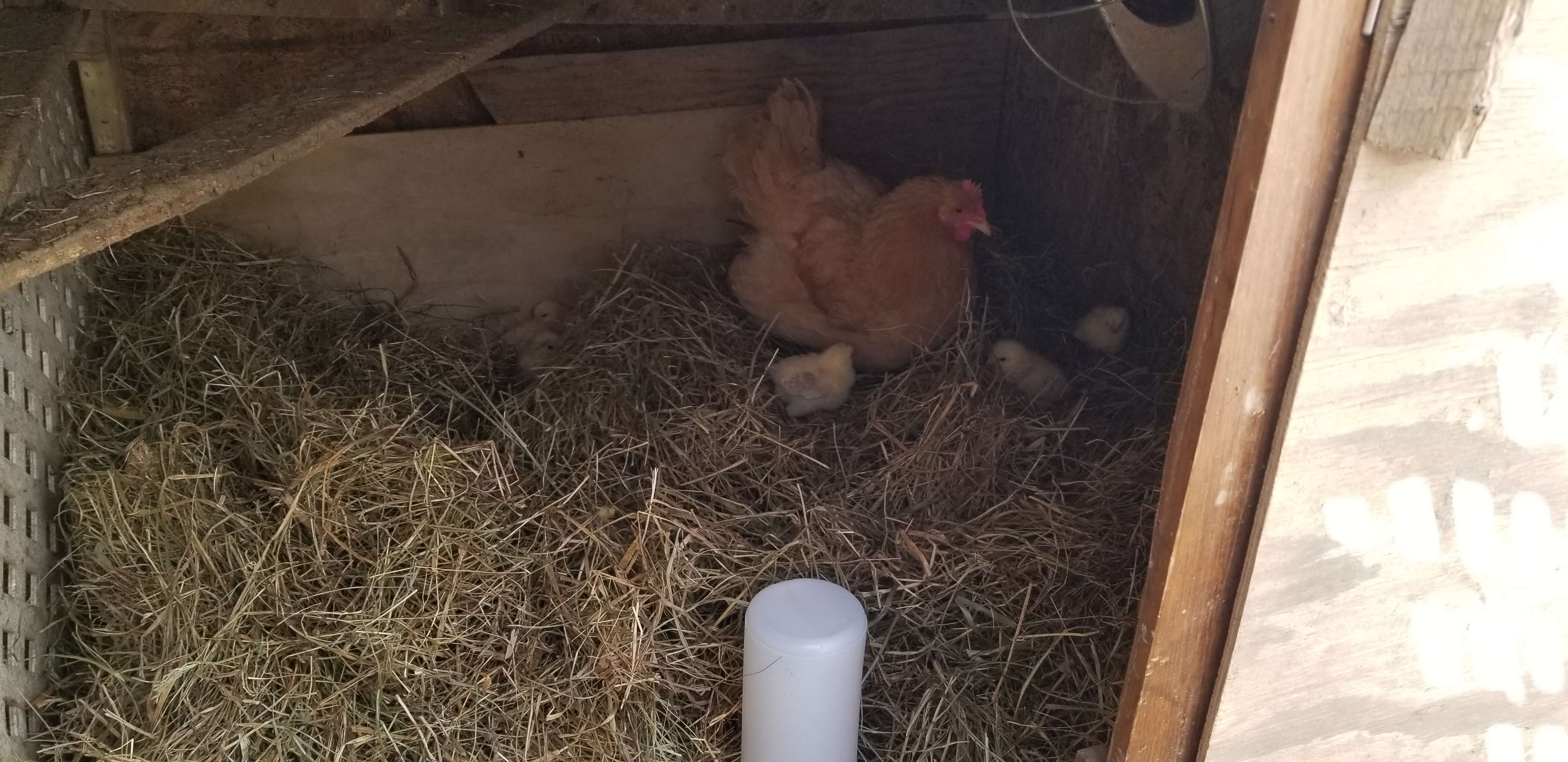 Momma Bird & Babies now have a 4×4 area with lots of fresh hay to hang out in. Much more comfortable, and I have the brooder light in there to help on the cold days that keep hitting at random.