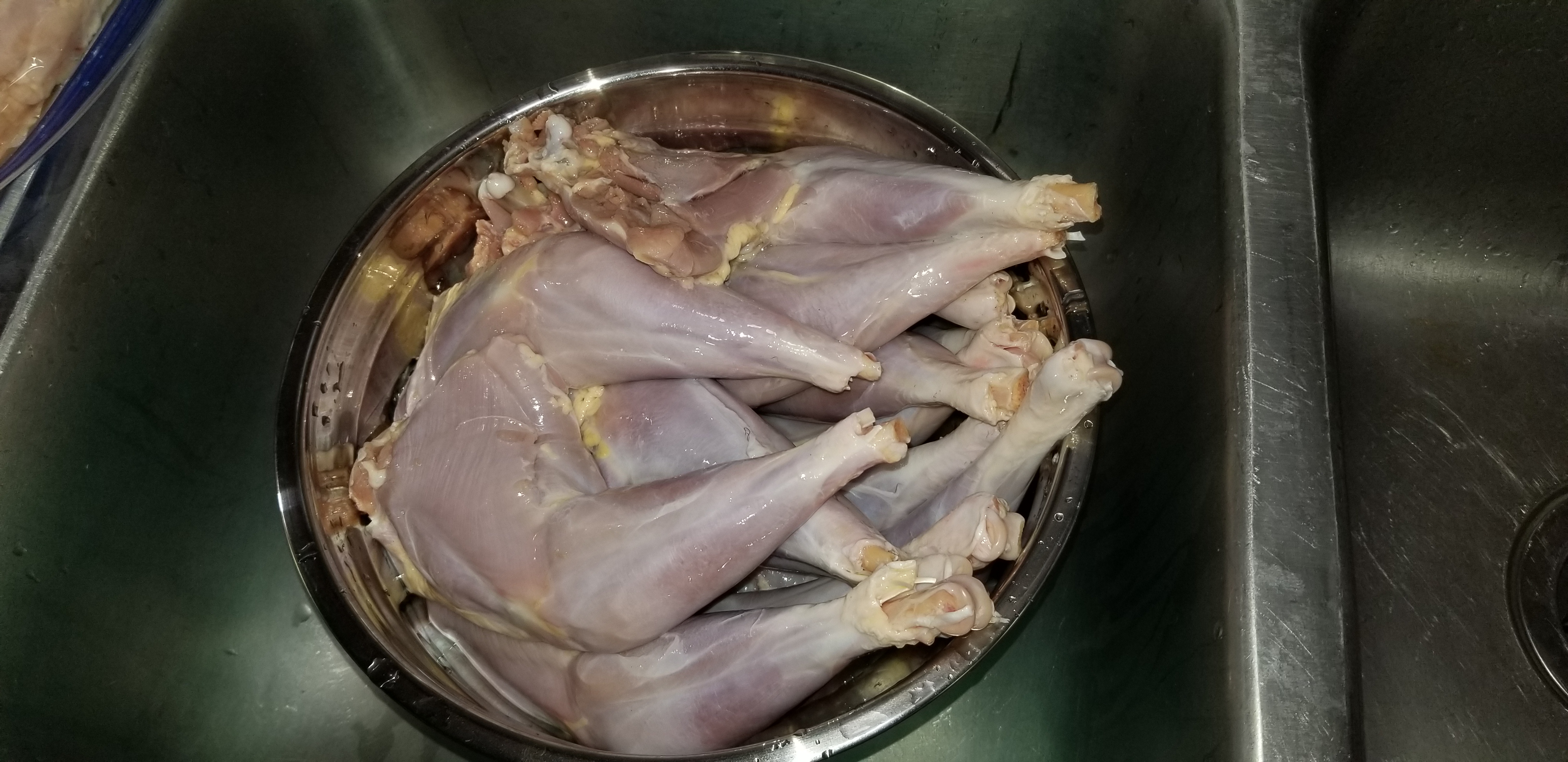 With the help of my sister who was up for a visit, I spent about 2-1/2 hours dispatching and skinning out 7 of them. I decided that they were not quite filled out as much as I wanted at only 22 weeks, so I spared eight of them and threw them into the grow-out pen for another month.